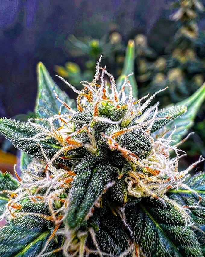 Pineapple’s buds are rather large for such a fast plant. Internodal spacing is tight, and the flowers tend to join together into one large cola. The flowers are fluffy, bright green, and have a range of yellow, orange, and amber colored pistils.